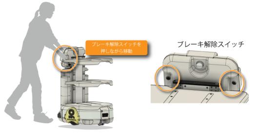 ブレーキ解除スイッチを押している間は、ロボットのブレーキが解除され、軽く押すだけで移動できます。