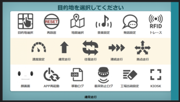 | 再設置画面 | ロボットがルートを外れ、あるいはバンパセンサが反応した場合、手動で再設置させる画面 |