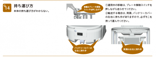 ロボットを移動する際は、必ず左右のブレーキ解除スイッチを同時に押しながら動かしてください。スイッチを押さずに動かそうとしたり、片方のスイッチだけを押して動かしたりすると、モーターの寿命を早め、破損の恐れがあります。