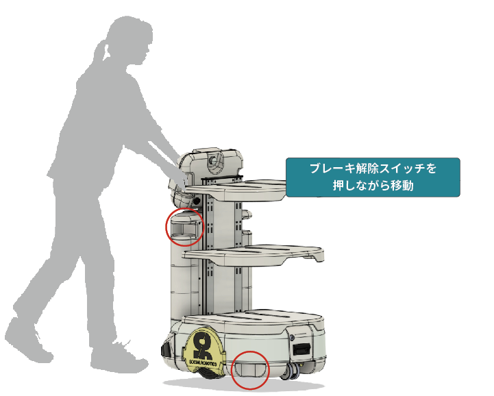ブレーキ解除スイッチを押している間は、ロボットのブレーキが解除され、軽く押すだけでロボットの移動ができるようになります。