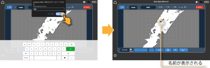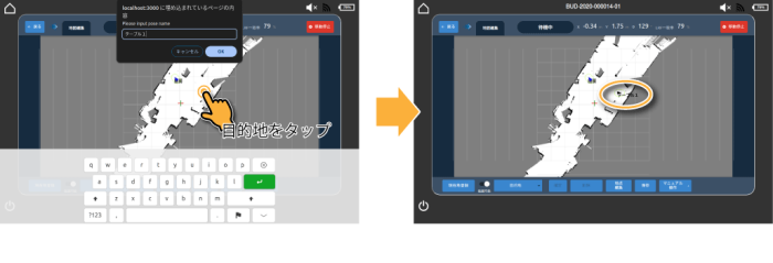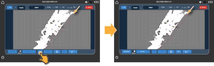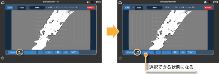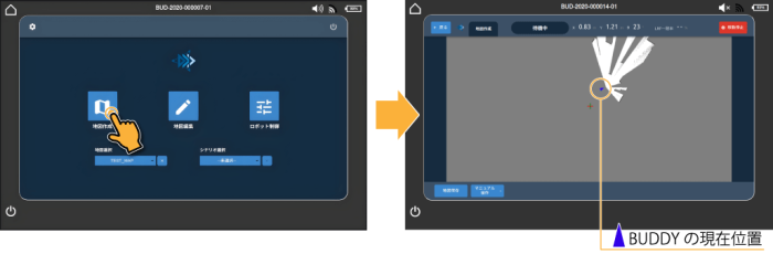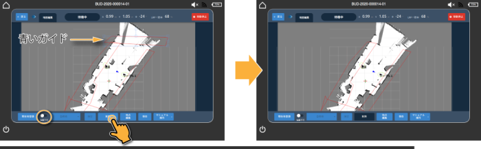 ご自身がロボットの前方に立つと環境スキャンセンサを塞いでしまいますので、ロボットの右か左に立って、ロボットと並ぶようにして作業を行うとスムーズです。